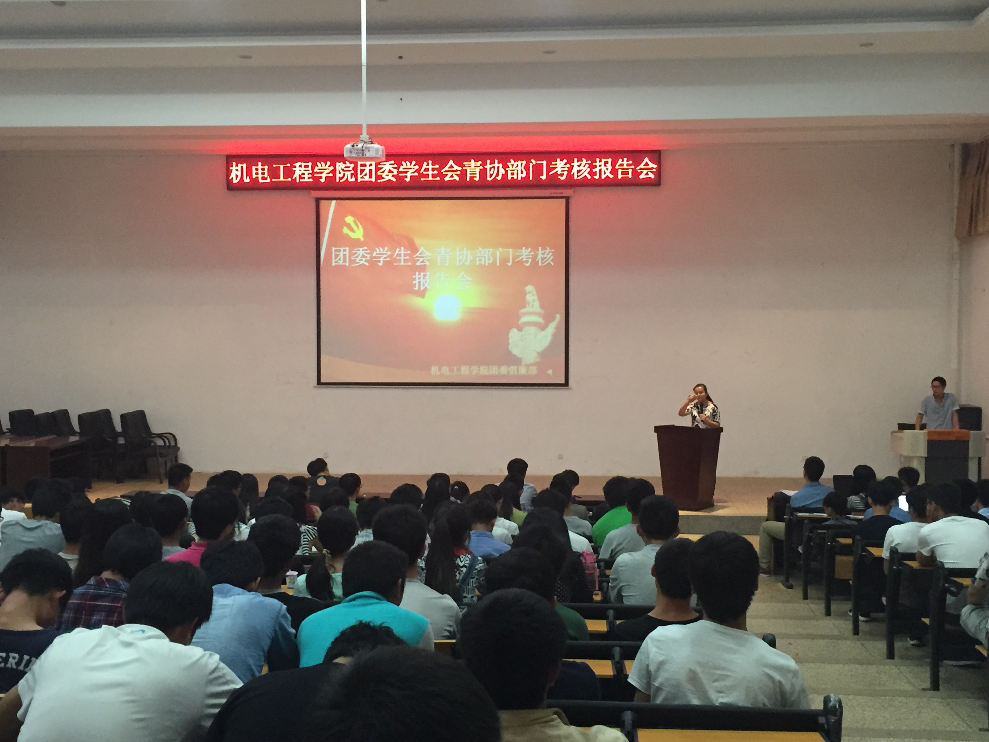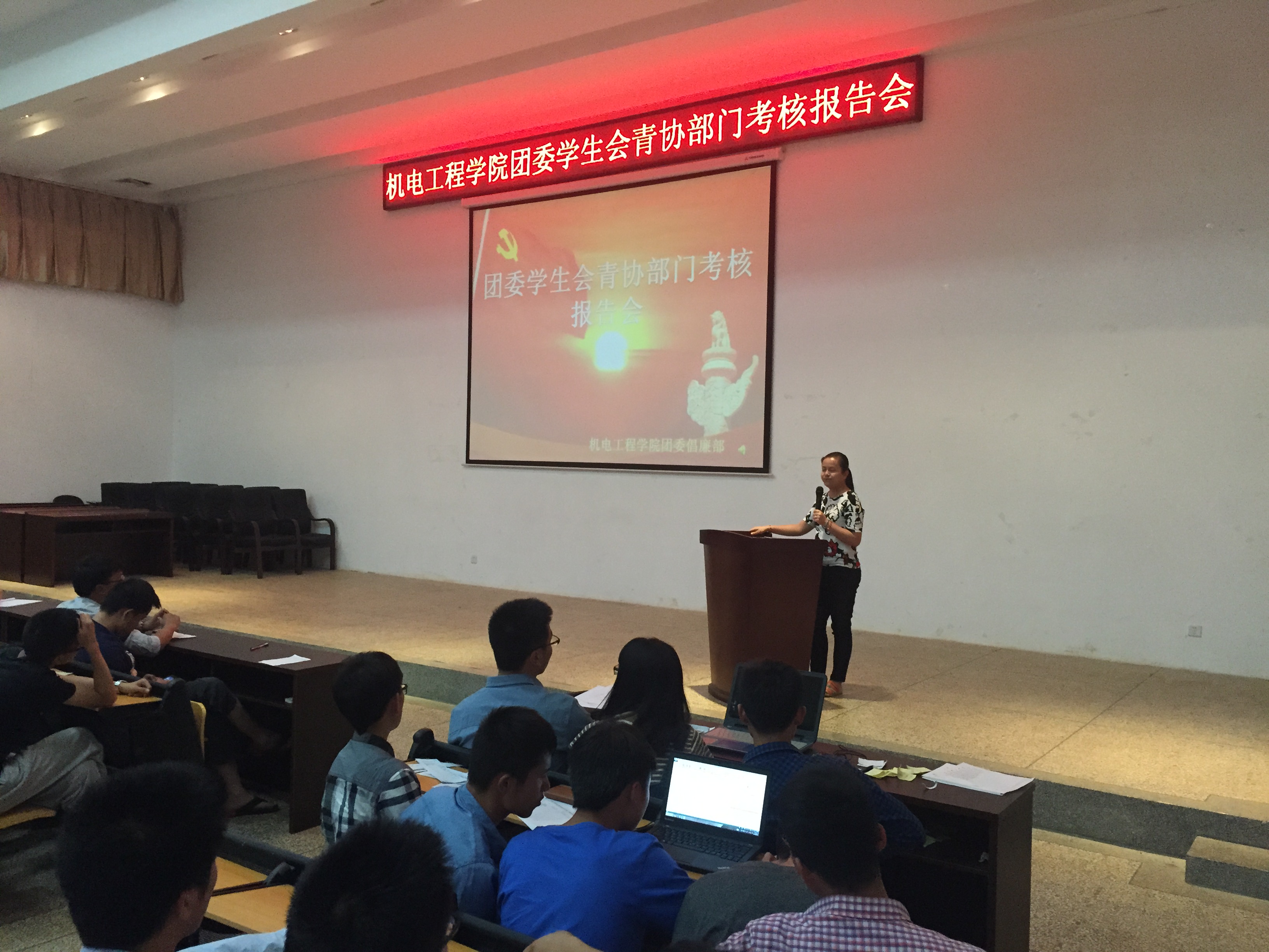 为加强我院学生干部队伍的自身建设,树立良好的工作作风,提高我院团学队伍的整体素质,促进各部门之间的交流合作。我院于2015年5月13日晚19:00在机电楼报告厅举办了“机电工程学院团委、学生会、青协部门考核报告会”。机电工程学院学工办主任高老师、团委书记杨老师、学工办辅导员杨老师和祝老师出席了此次活动并担任评委,本次活动由我院团委倡廉社承办。